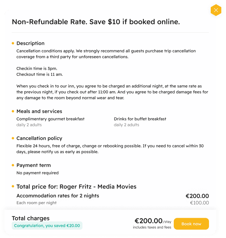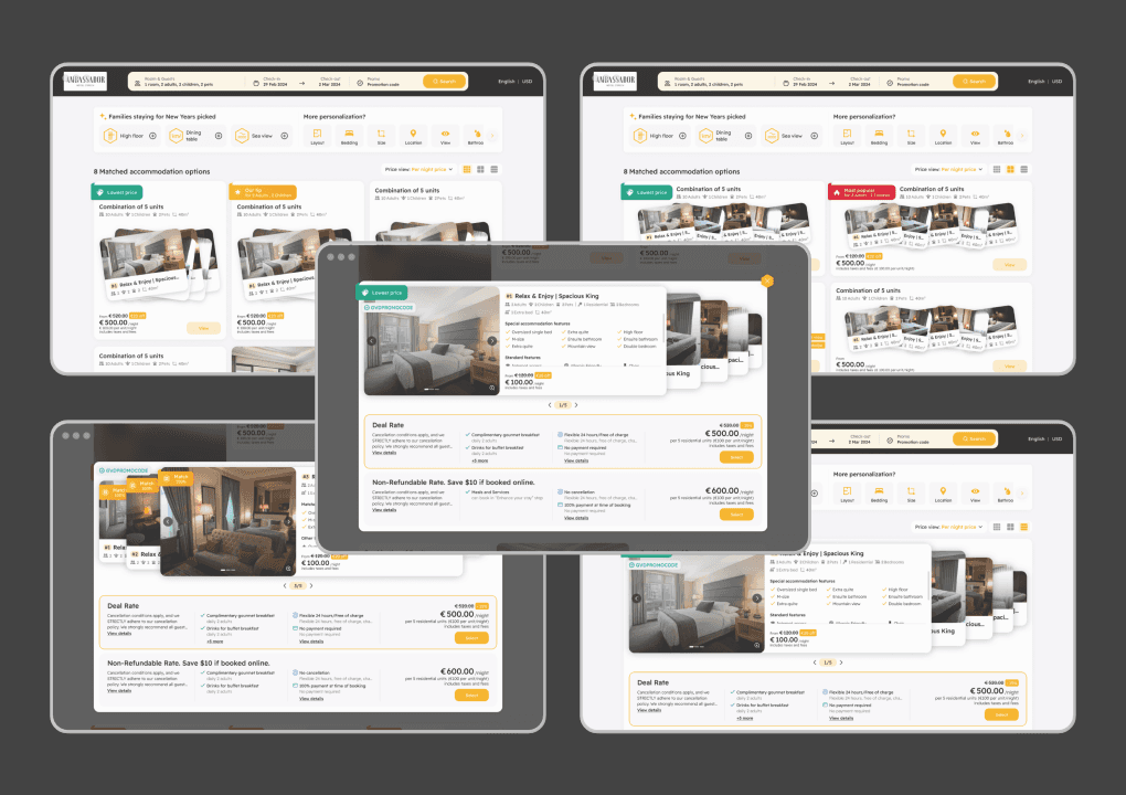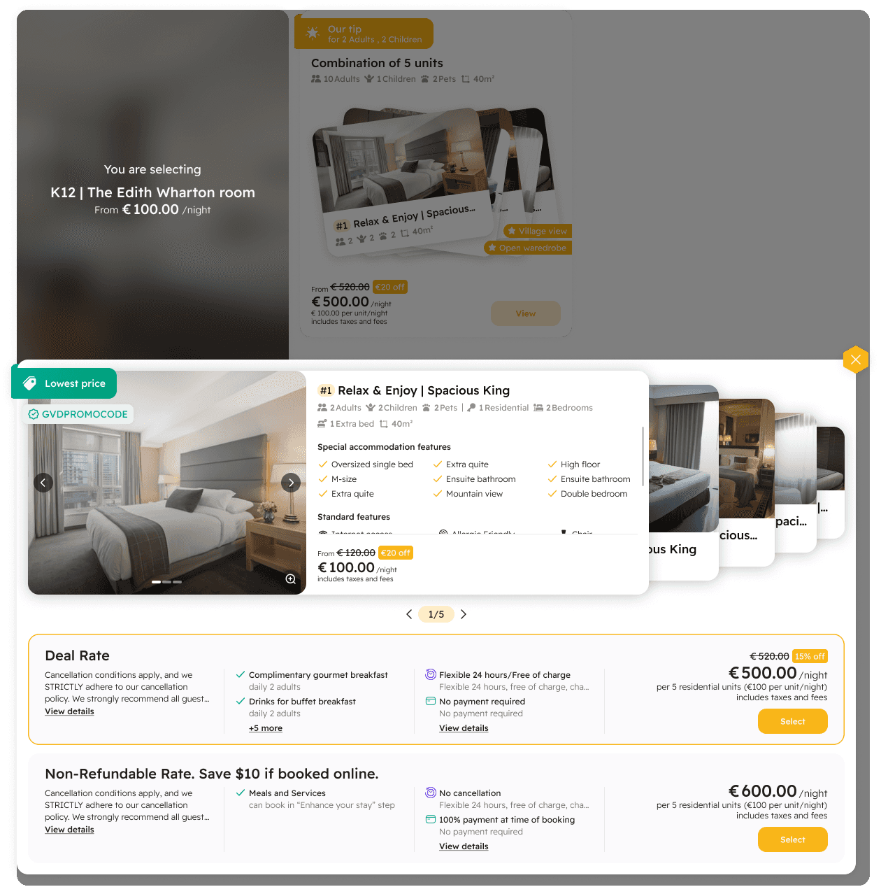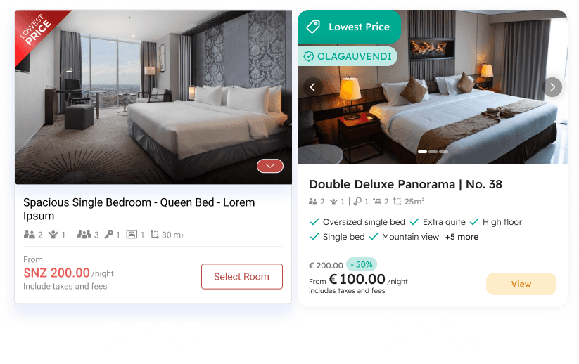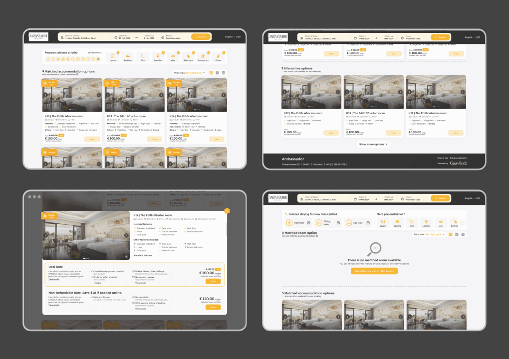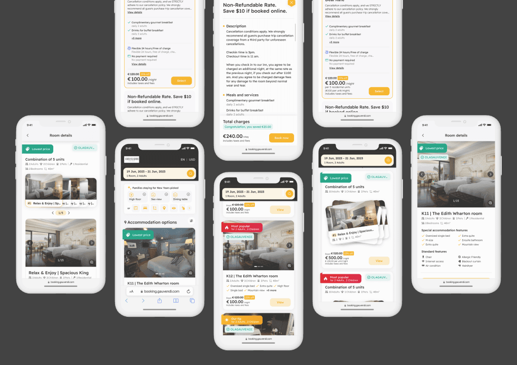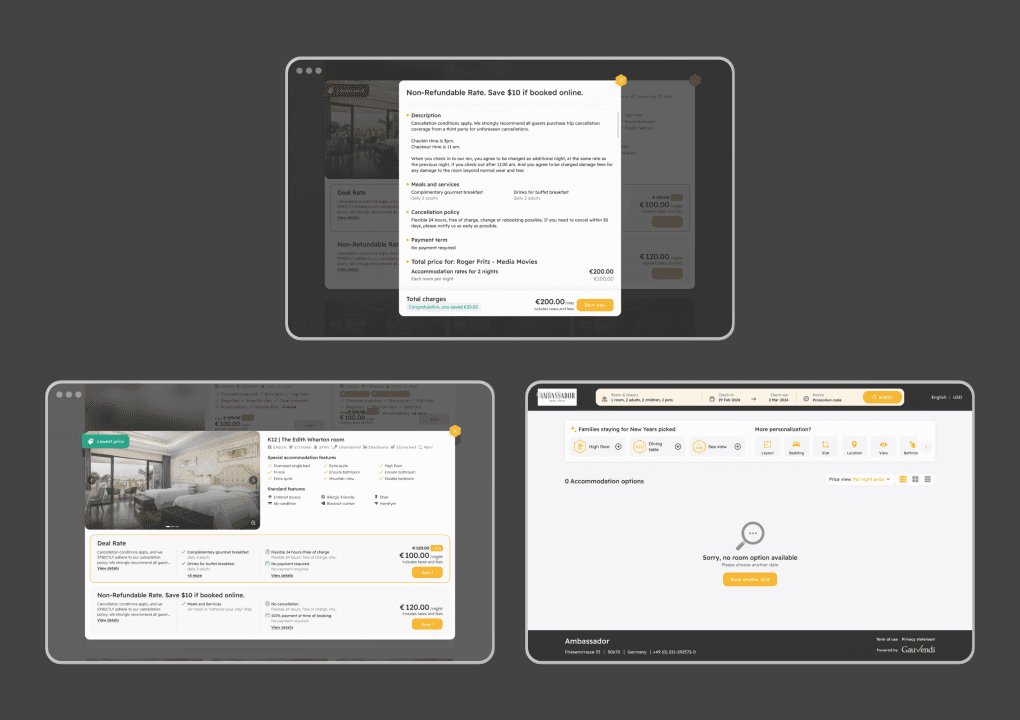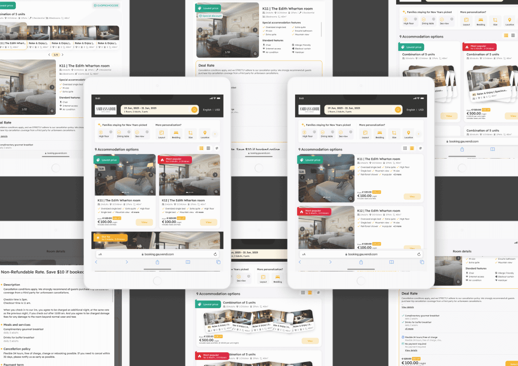 GauVendi ISE is a platform aimed at facilitating hoteliers in selling their rooms, sales plans, bundles and extra services more efficiently. For end-users, ISE helps them discover their ideal room effortlessly, prioritizing hyper-personalization. Users can choose their preferred room at the most reasonable price. Also, hoteliers can customize the interface colors of the ISE to align with their hotel's branding, ensuring consistency with their brand identity.